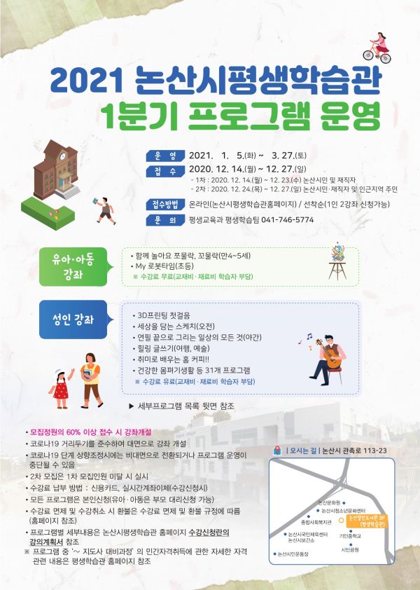 2021년 논산시평생학습관 1분기 프로그램은 인문교양, IT, 시민교육, 건강, 직업능력 등 6개 분야 33개 프로그램에 대해 각 10~15명의 학습자를 모집할 예정이며 오는 2021년 1월 5일부터 3월 27일까지 운영된다.