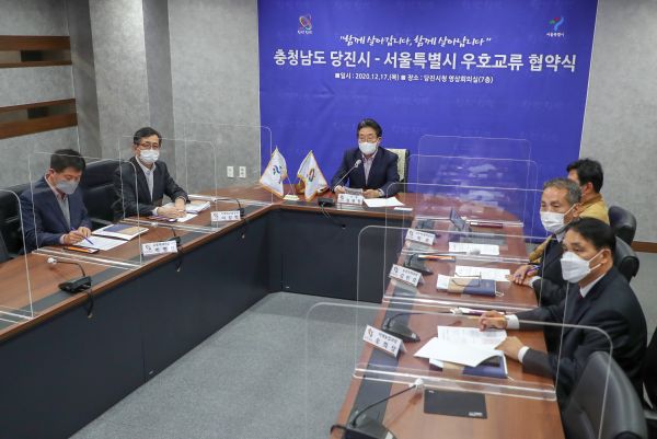 17일 김홍장 당진시장과 서정협 서울시장 권한대행은 영상을 통해 ‘당진시-서울특별시 우호교류 협약식’을 비대면으로 갖고 두 지역이 활용할 수 있는 자원을 최대한 공유하고 지속가능한 협력사업을 추진키로 약속했다.