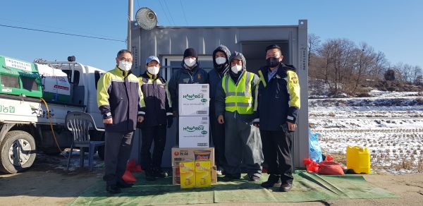 강기룡 회장과 배석태 대장은 “코로나19로 모두 힘든 시기에 AI 확산 방지를 위해 추운 날씨에도 불구하고 24시간 고생하는 근무자들에게 감사드리며 끝까지 방역에 최선을 다해 달라”고 당부했다.