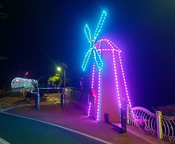 장미넝쿨이 자라던 초입구 구조물엔 형형색색 전구를 이용해 루미나리에로 재탄생시키고 최근 설치한 모형 풍차에도 경관 조명을 설치해 색다른 볼거리를 제공하고 있다.