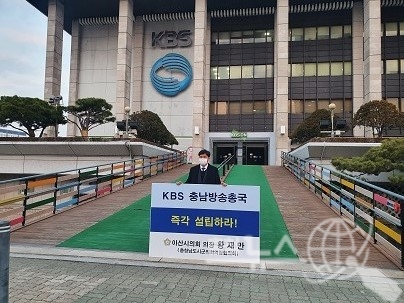 아산시의회 황재만 의장이 22일 서울 KBS 본사 앞에서 KBS 충남방송총국 설립을 촉구하는 충남시군의회 의장협의회 1인 릴레이 시위에 나섰다“고 밝혔다.