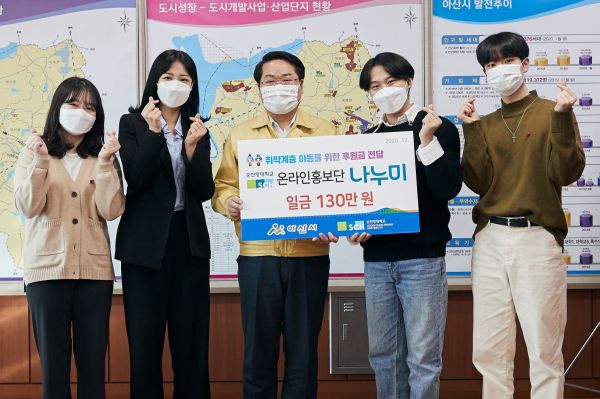 한편 순천향대학교 온라인 홍보단 나누미는 2018년부터 3년째 아산시를 통해 취약계층 아동들에게 성금을 전달하고 있다.