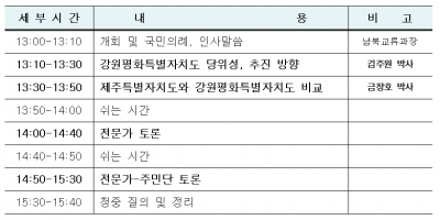 도가 주최하고 한국지방자치학회가 주관하여 개최하는 이번 설명회에서는 전문가의‘강원평화특별자치도’강의에 이어 전문가와 18개 시·군 대표 18명이 참여하는 도민 대토론회가 열린다. 道는 이번 설명회가 그동안의 탑다운 의사전달 방식이 아닌 주민과의 양방향 소통의 장으로 주민이 정책 결정에 직접 참여하는 만큼, 시군 주민들의 적극적인 참여를 통한 공론화의 장으로 승화할 예정이다.