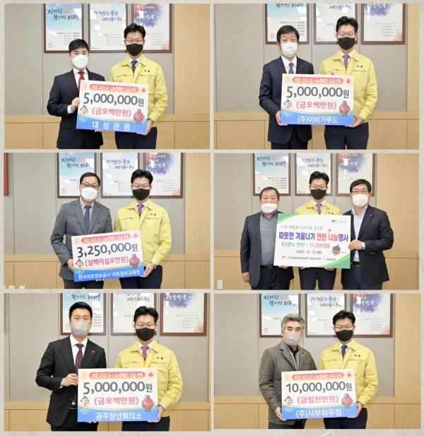 이에 앞서 지난 22일에는 ㈜이비가푸드 500만원, 한국국토정보공사 국토정보교육원 325만원, 농협중앙회 공주시지부 나눔축산운동본부 연탄 1만 1천장, 공주청년회의소에서 500만원을 불우이웃돕기 성금으로 전달했다.