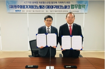 21일 대구테크노파크와 원주의료기기테크노밸리는 이날 테크노밸리 의료기기종합지원센터에서 ICT 기반 융복합 의료기기 산업 진흥을 위한 협력체계 구축 등을 주요 내용으로 하는 업무협약을 체결했다고 밝혔다.
