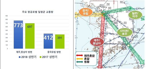 항공로별 교통량에서, 우리나라 하늘길 중에서 가장 바쁜 구간은 ‘서울-제주·동남아’ 구간이며, 하루 평균 773대가 이용하고 있다. 이는 전년 동기 대비 11.4%가 증가한 것이다