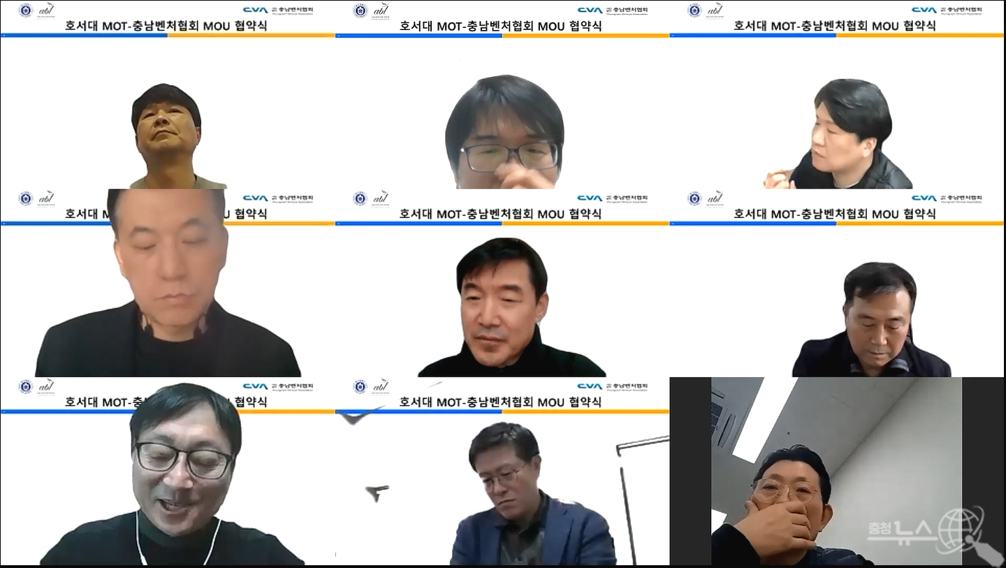이날, 협약식은 코로나19 상황을 고려해 비대면 온라인으로 진행됐으며 호서대 기술경영전문대학원 이종원 원장, 박승범 사업단장, 정희운 학과장, 권영일 교수, 김동회 교수, 박병기 교수, 조성규 교수와 충남벤처협회 남승일 회장, 홍봉택 사무총장 등이 참석했다.