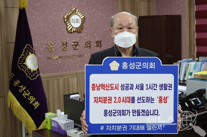 윤용관 홍성군의회의장이 14일 ‘자치분권 기대해 챌린지’에 동참하며 충남혁신도시 조성 등 당면업무 추진 시 주민중심의 지방자치가 실현될 수 있도록 자치분권 2.0을 선도해 나가기로 했다.