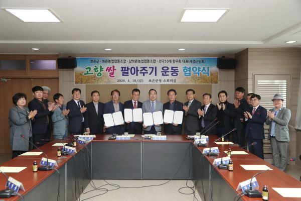 지난해 4월 보은군수와 곽덕일 보은농협조합장, 박순태 남보은농협조합장, 전국 10개 도시 보은향우회 대표로 참석한 정영기 재경보은군민회장이 고향 쌀 팔아주기 운동 협약을 맺고 보은에서 생산되는 찰지고 맛좋은 “삼광쌀”팔아주기에 나섰다.
