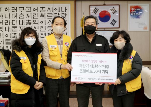 [충청뉴스큐] ‘대한적십자사봉사회 태안지구협의회’가 지난 18일 태안군청 군수 집무실에서 가세로 군수, 협의회 관계자 등이 모인 가운데 어려운 이웃을 위해 써달라며 ‘사랑의 온열매트’ 50개을 기탁했다.