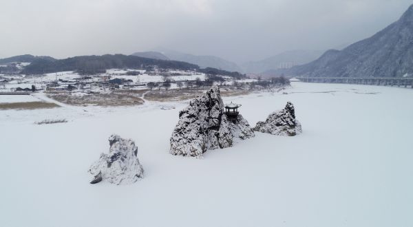 [충청뉴스큐] 대설주의보가 발효 중인 지난 18일 충북 단양군의 도담삼봉을 하얀 눈이 살포시 감싸 아름다운 설경을 뽐내고 있다.