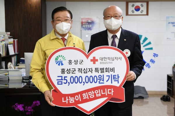 [충청뉴스큐] 김석환 홍성군수는 지난 19일 군수실에서 유창기 대한적십자사 충남지사회장이 참석한 가운데 ‘2021년도 적십자 희망 나눔 특별성금’으로 500만원을 전달했다.