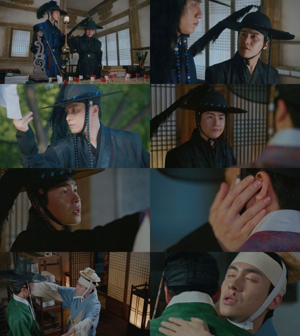 지난 3회에서 홍별감이 영평군에게 자백제를 건네는 신에서 ‘품에서 호리병을 꺼내어’ 정도로 표현되어 있던 지문이었지만, 이재원은 현장에 있던 소품인 촛대 아래에 호리병을 감춰두고 이 촛대를 움직여 영평군을 괴롭히는 디테일을 더해 깨알 웃음을 전했다.
