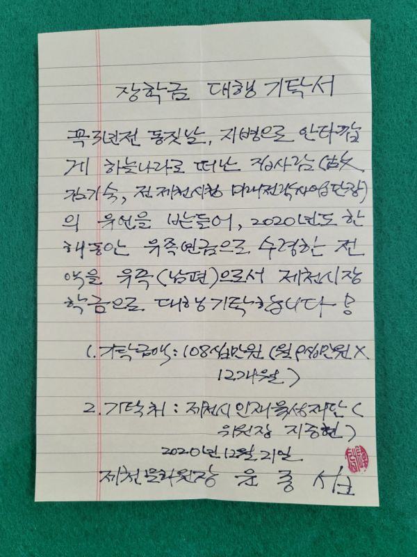 [충청뉴스큐] “3년 전 동짓날, 지병으로 안타깝게 하늘나라로 떠난 집사람의 유언을 기리며” 제천시 인재육성재단은 윤종섭 제천문화원장이 아내의 뜻에 따라, 2020년도 한 해 동안 모아놓은 유족연금 전액 1,080만원을 기탁했다고 밝혔다.