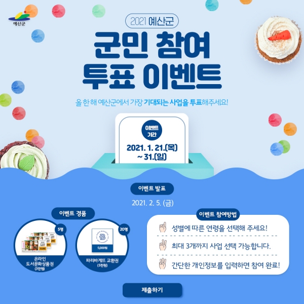 군은 1월 21일부터 31일까지 예산군 공식 페이스북을 통해 ‘2021년 가장 기대되는 사업 투표’ 이벤트를 진행 중이다.