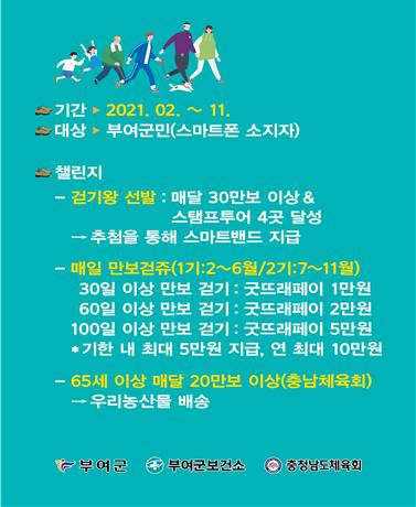군은 올해도 부여군민의 걷기운동 실천을 장려하기 위해 매일만보 걷기 챌린지 달성 시 연 최대 10만원 상당의 굿뜨래페이 지급 걷쥬왕 스탬프 투어 달성 시 매월 추첨을 통해 스마트밴드를 지급하는 챌린지를 진행할 예정이다.