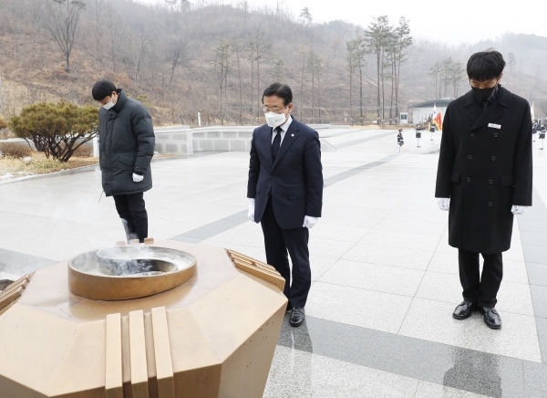 [충청뉴스큐] 이차영 괴산군수가 1일 괴산군 문광면에 위치한 괴산국립호국원을 방문해 현충탑에 분향한 뒤 묵념을 하고 있다.
