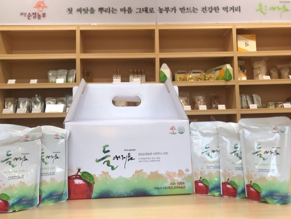 사과주스는 110㎖ 스탠딩 파우치 30봉 1박스로 판매된다.