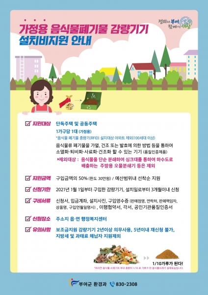 보조금 신청 대상은 음식물류폐기물 감량기기 설치보조금 지원 계획 공고일 이전까지 부여군에 주소를 둔 세대주로서 올해 사업에서는 음식물류폐기물 종량제 시범사업 대상지인 100세대이상 아파트 11개 단지는 제외되며 지원 금액은 기기 구입금액의 50%까지 지원한다.