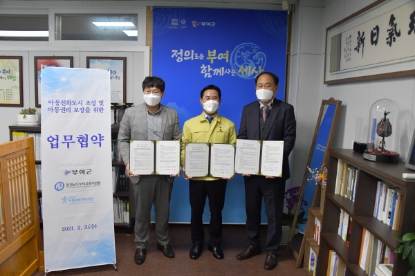 [충청뉴스큐] 부여군은 지난 3일 충청남도부여교육지원청, 충남아동보호전문기관과 아동친화도시 조성 및 아동권리 보장을 위한 업무협약식을 가졌다.