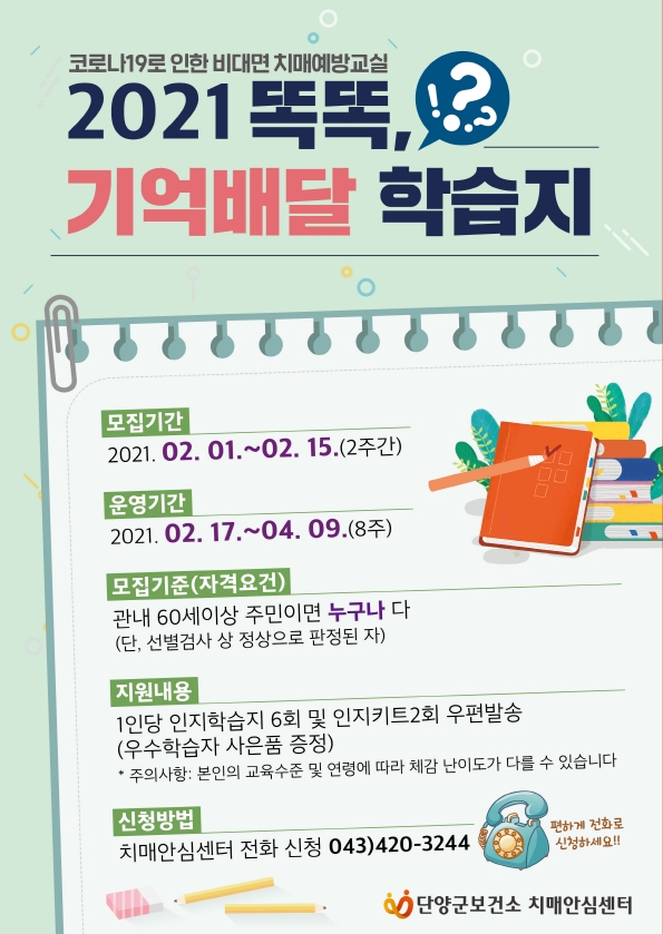 [충청뉴스큐] 단양군치매안심센터는 기존 진행하던 대면 프로그램인 치매예방교실을 인지학습지와 인지키트 배송을 통한 비대면 학습프로그램인 ‘똑똑, 기억배달학습지’ 사업으로 전환해 운영한다고 지난 9일 밝혔다.