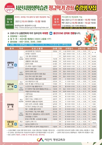 상반기 정규강좌는 서산시평생학습관 이전장소〔서산시 안견로 252 대신증권〕에서 3월 5일부터 운영되며 코로나 상황에 따라 줌 비대면 강의로 전환 운영된다.