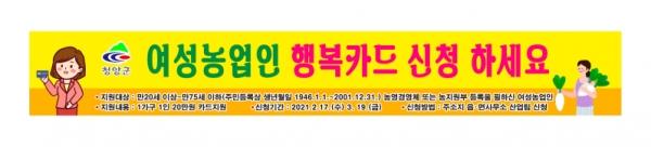 [충청뉴스큐] 청양군은 여성농업인 복지증진 및 문화생활 지원을 위한 ‘여성농어업인 행복카드’ 신청·접수를 2월 17일부터 3월 19일까지 받는다.