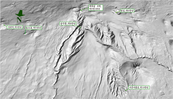 논문에 따르면 한라산의 아흔아홉골-약 10만년, 삼각봉-약 8만년, 영실-약 6만년, 성판악-약 3만년, 한라산 백록담 서벽-약 2만3천년, 돌오름-약 2천년 등 각기 시기를 달리해 분출됐다.