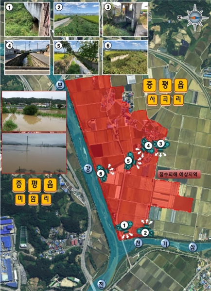 이 지역은 저지대에 농경지와 주거지가 위치해 호우로 보강천의 수위가 상승하면 배수능력 저하로 침수피해가 우려되는 지역이다.