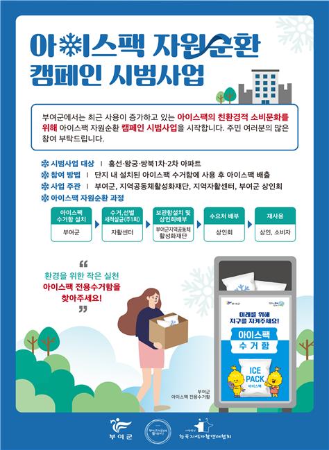 이번 캠페인은 부여읍 아파트 4개소에 시범적으로 아이스팩 수거함을 설치해 주민 모두가 친환경적 소비문화에 참여할 수 있도록 배려했으며 모아진 아이스팩은 부여지역자활센터에서 수거해 세척·살균 작업을 거쳐 부여군지역공동체활성화재단에 전달한다.
