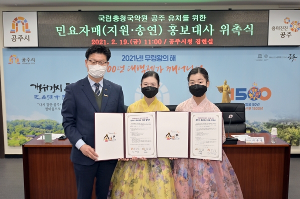 공주시는 19일 시청 집현실에서 2019년 남상일 2020년 김영임에 이어 올해 이지원, 이송연 민요자매를 국립충청국악원 공주 유치 홍보대사로 위촉하고 홍보활동에 박차를 가하기로 했다고 밝혔다.