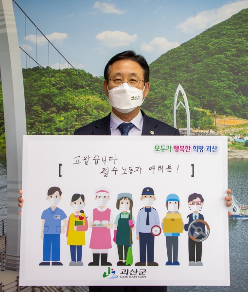[충청뉴스큐] 이차영 괴산군수가 19일 코로나19 상황에도 대면업무가 불가피한 필수노동자를 응원하는 ‘고맙습니다, 필수노동자’ 캠페인에 동참했다.
