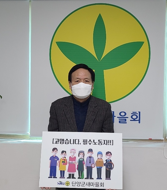 [충청뉴스큐] 단양군새마을회는 오수원 단양군새마을회장이 코로나19 확산에도 맡은 업무에 충실히 임하고 있는 대면 업무 근로자들에게 응원과 감사의 마음을 전하기 위해 ‘고맙습니다 필수노동자’ 캠페인에 참여했다고 지난 22일 밝혔다.
