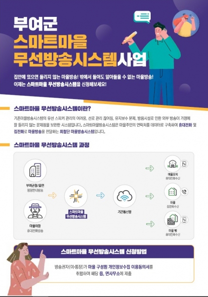 박정현 부여군수는 “읍·면 행정복지센터를 통해 스마트 마을무선방송시스템을 활용할 마을 및 주민 개인정보 수집 동의서를 수집 중에 있으며 서비스를 희망하는 마을은 반드시 신청하셔서 기존 시스템의 잦은 고장과 불편을 해소함은 물론 마을방송을 손쉽게 활용할 수 있기를 기대한다”고 말했다.