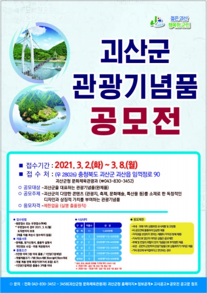 [충청뉴스큐] 충북 괴산군은 괴산을 대표하는 특색 있고 차별화된 우수 관광기념품을 발굴·육성하기 위해 추진하는 ‘괴산군 관광기념품 공모전’ 작품을 이달 8일까지 접수한다고 밝혔다.