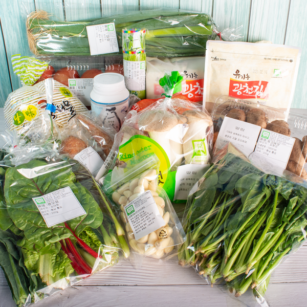 친환경농산물 꾸러미는 친환경농산물 인증을 받은 농산물과 축산물, 유기가공식품 등으로 구성되어 있다.