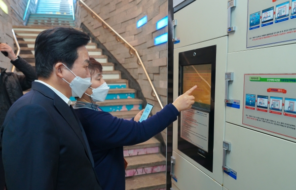 이어서 원희룡 지사는 여성 안심 무인택배 보관함이 설치된 중앙로 지하상가를 찾아 관리기관인 ‘중앙지하상점가 진흥사업 협동조합’ 관계자와 함께 보관함 운영현장을 점검하고 애로사항을 청취했다.