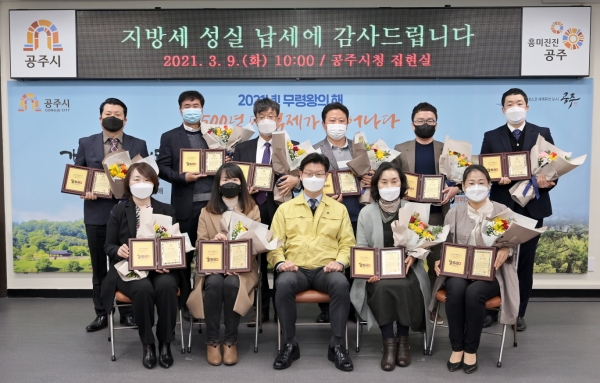 [충청뉴스큐] 공주시는 지난 9일 시청 집현실에서 지방세를 성실하게 납부한 법인과 개인을 으뜸납세자 선정하고 감사패를 수여했다.
