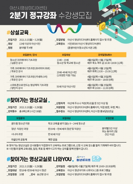 또한, ‘찾아가는 영상교실로 나와YOU’ 1과정을 청년아지트 나와유에서 만18~39세 아산시 청년들을 대상으로 진행할 예정이다.
