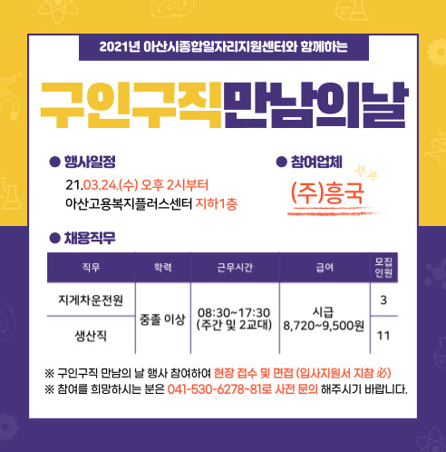 이 날 행사의 구인업체인 ㈜흥국은 굴삭기용 부품 등을 개발·생산하는 제조업체로 둔포면에 사업장을 두고 있다.