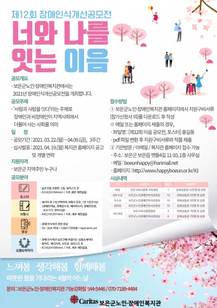 [충청뉴스큐] 보은군노인장애인복지관은 지역 내 초·중·고등학생을 비롯한 모든 군민을 대상으로 ‘사람과 사람을 잇다’라는 뜻의 ‘이음’을 주제로 장애인식개선 공모전을 실시한다고 19일 밝혔다.
