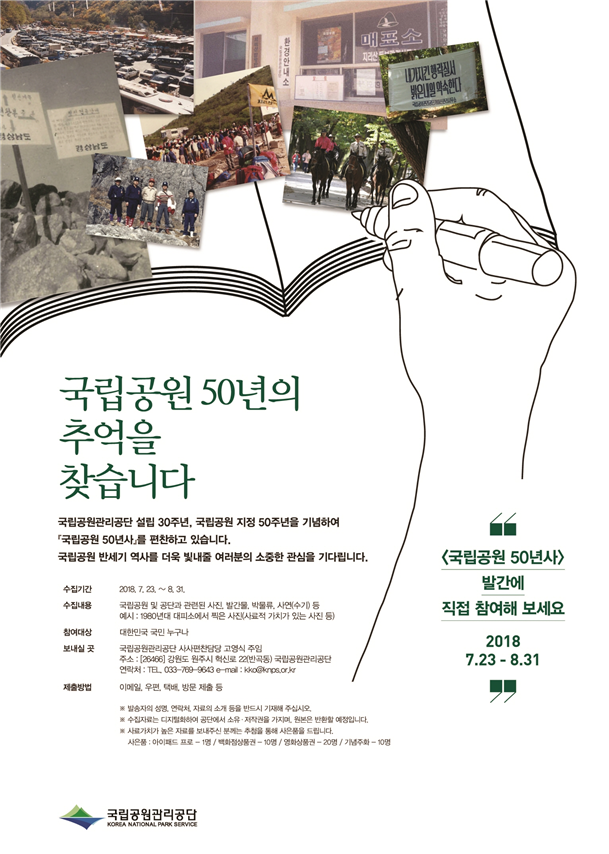 [충청뉴스큐]환경부 산하 국립공원관리공단은 국립공원 50년과 국립공원관리공단 30년의 역사서 발간을 위해 23일부터 오는 8월 31일까지 대국민 사료 공모를 진행한다고 밝혔다.