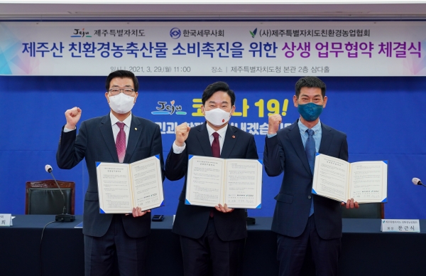 제주도는 29일 오전 11시 제주도청 본관 2층 삼다홀에서 한국세무사회와 제주특별자치도 친환경농업협회와 함께 ‘제주산 친환경농축산물 소비촉진을 위한 상생 업무협약’을 체결했다고 밝혔다.
