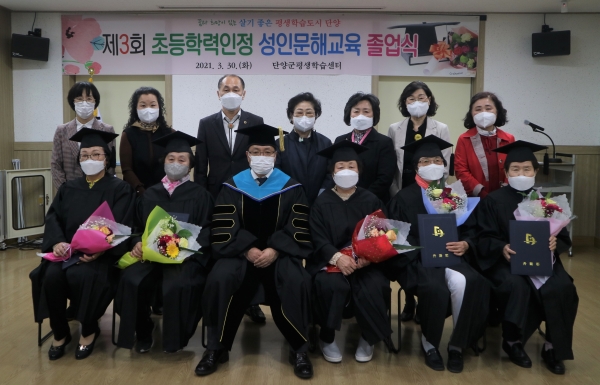 [충청뉴스큐] 평생학습 도시 단양군은 지난 달 30일 단양군평생학습센터에서 만학의 꿈을 위한 도전에 큰 용기를 낸 제3회 초등학력인정 성인문해교육 졸업생들에게 학력인정서를 전달했다고 밝혔다.