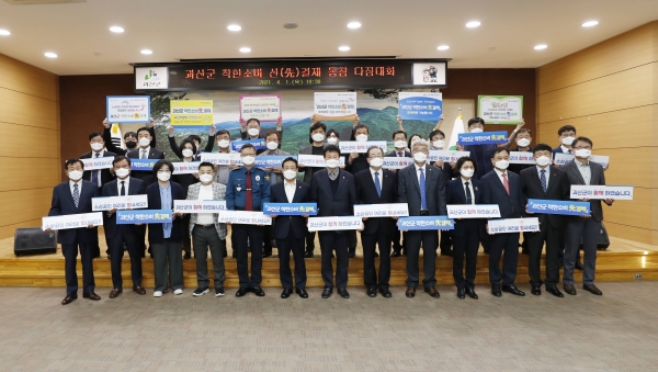 [충청뉴스큐] 충북 괴산군은 1일 군청 대회의실에서 코로나19로 어려움을 겪고 있는 소상공인을 지원하기 위한 ‘괴산군 착한소비 선결제’ 동참 다짐대회를 개최했다.