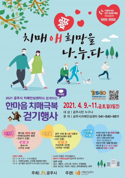이번 행사는 치매예방에 좋은 ‘걷기’를 실천하면서 치매에 대한 부정적인 인식개선과 치매예방·관리에 대한 중요성을 전달하기 위해 4월 9일부터 11일까지 실시된다.
