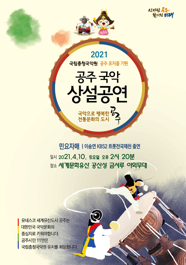 황의정 문화체육과장은 “세계유산도시이며 국악의 도시 공주에서 국악의 묘미를 만끽하며 지친 일상에 작게나마 힐링과 위로의 시간을 가졌으면 한다”며 “공주만의 명품 브랜드 공연으로 발전시킬 수 있도록 노력하겠다”고 전했다.