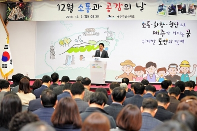원희룡 지사는 이날 오전 제주도청 4층 탐라홀에서 진행된 12월 ‘소통과 공감의 날’에서 “도민들의 기대와 약속을 현실로 만들어 나가기 위해 많은 기획과 준비과정이 있었다”고 올해를 회고하며 이같이 밝혔다.