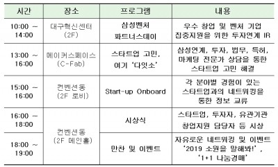 삼성벤처 파트너스데이는 삼성벤처투자가 지역의 유망한 벤처·창업기업 발굴하여 투자하기 위한 행사이다. 10시~오후 2시까지 캠퍼스 내 대구창조경제혁신센터 2층 행사장에서 개최된다. 서류심사를 거친 7개사의 IR가 있을 예정이다.