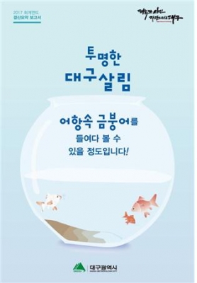 대구시는"시민이 알기 쉬운 결산보고서"를 통해 우리시 살림살이 규모와 재정운영 성과를 시민들에게 알려 보다 많은 시민들이 市 재정운영에 관심을 가지고 한 단계 더 발전하기를 기대하고 있다.